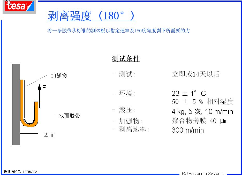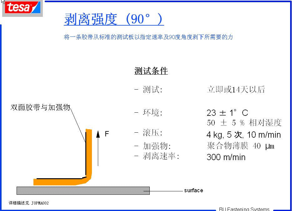 1)取25.4mm 寬、200mm 長的TESA 7475 膠帶貼于膜的測試面(離型面),并用2KG 標(biāo)準(zhǔn)碾壓手輥碾往復(fù)碾壓3次。(注意:要一邊貼全一邊碾壓,避免貼膠帶時(shí)于離型膜之間有氣泡;2)貼好膠帶后靜置20 分鐘,實(shí)驗(yàn)室的溫濕度分別控制在23±2℃及50±5%;